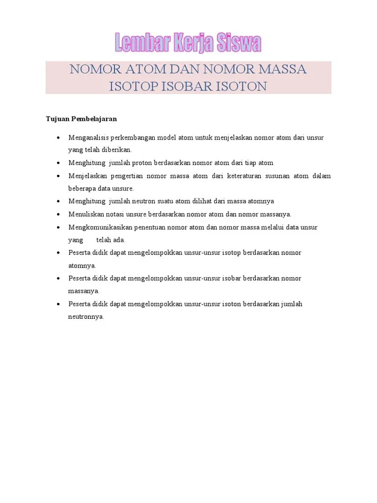 Diketahui bahwa nomor atom merupakan identitas dari atom, sehingga setiap atom yang mempunyai nomor atom yang sama maka unsurnya pun sama... Jadi, isotop yang berbeda dari suatu unsur berbeda dalam jumlah neutron. Isotop (isotope), berasal dari kata dalam bahasa yunani: 22.09.2021 · atom yang merupakan isotop satu sama lain adalah atom yang memiliki nomor atom yang sama (jumlah proton dalam inti), tetapi nomor massa berbeda (jumlah jumlah neutron dan jumlah proton dalam inti). Sebagian besar unsur kimia memiliki lebih dari satu isotop. Diketahui bahwa nomor atom merupakan identitas dari atom, sehingga setiap atom yang mempunyai nomor atom yang sama maka unsurnya pun sama... Diketahui bahwa nomor atom merupakan identitas dari atom, sehingga setiap atom yang mempunyai nomor atom yang sama maka unsurnya pun sama.